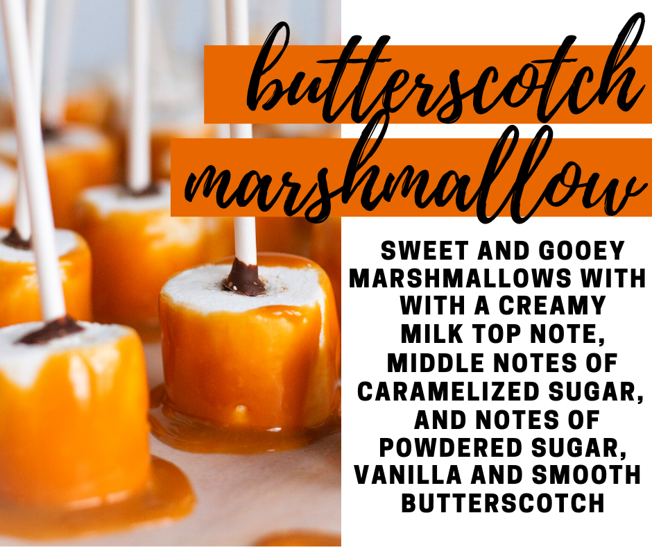 Butterscotch Marshmallow Fragrance Oil - Sweet and gooey marshmallows, creamy milk and warm caramelized sugar blended with vanilla and covered in smooth butterscotch.
