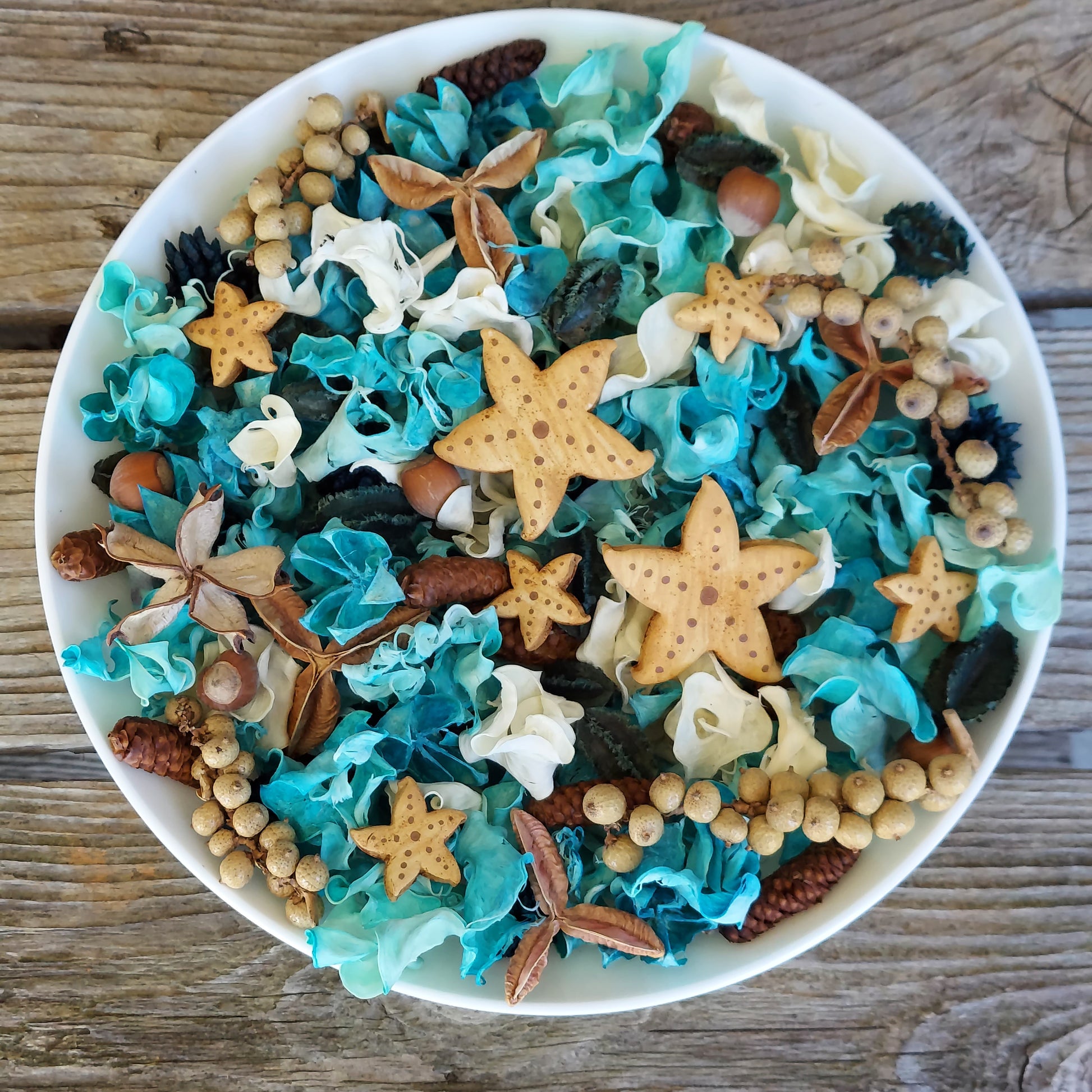 Dreaming of clear blue waters and warm sandy beaches? Our Sea Star Seas Potpourri is a blend of turquoise, tan and creamy white botanicals, pine cones, cinnamon sticks and berries accented with little handmade starfish! The shades of blue blend perfectly with the creamy whites and earth tones to give a clear blue sea feel to the potpourri.